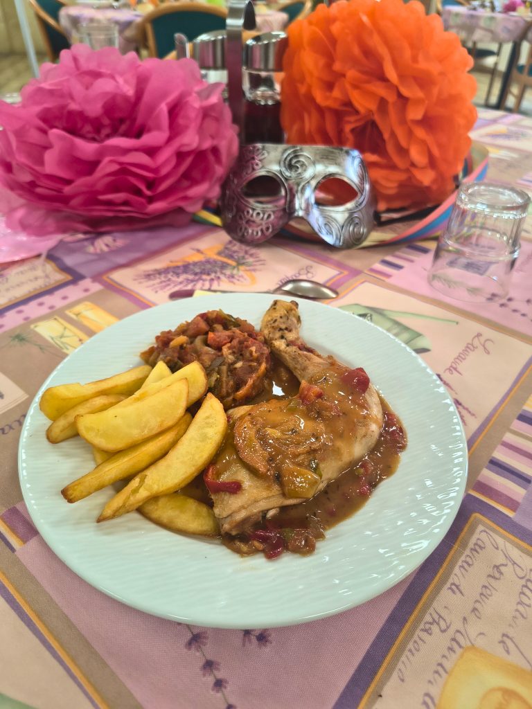 Plat : cuisse de poulet façon basquaise accompagnée de frites et d’une farandole de légumes